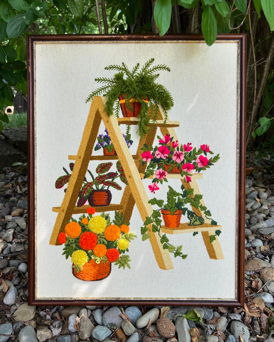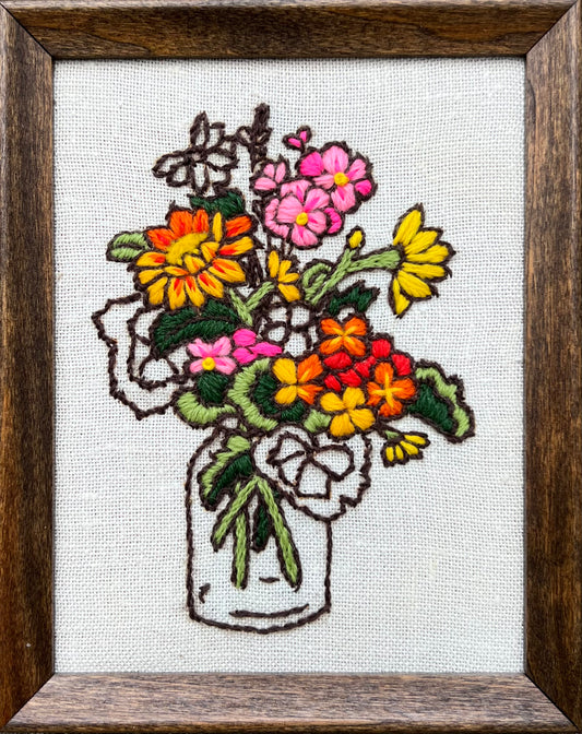Vintage Crewel: Bouquet of Pink, Red, Orange & Yellow Flowers in Glass Jar
